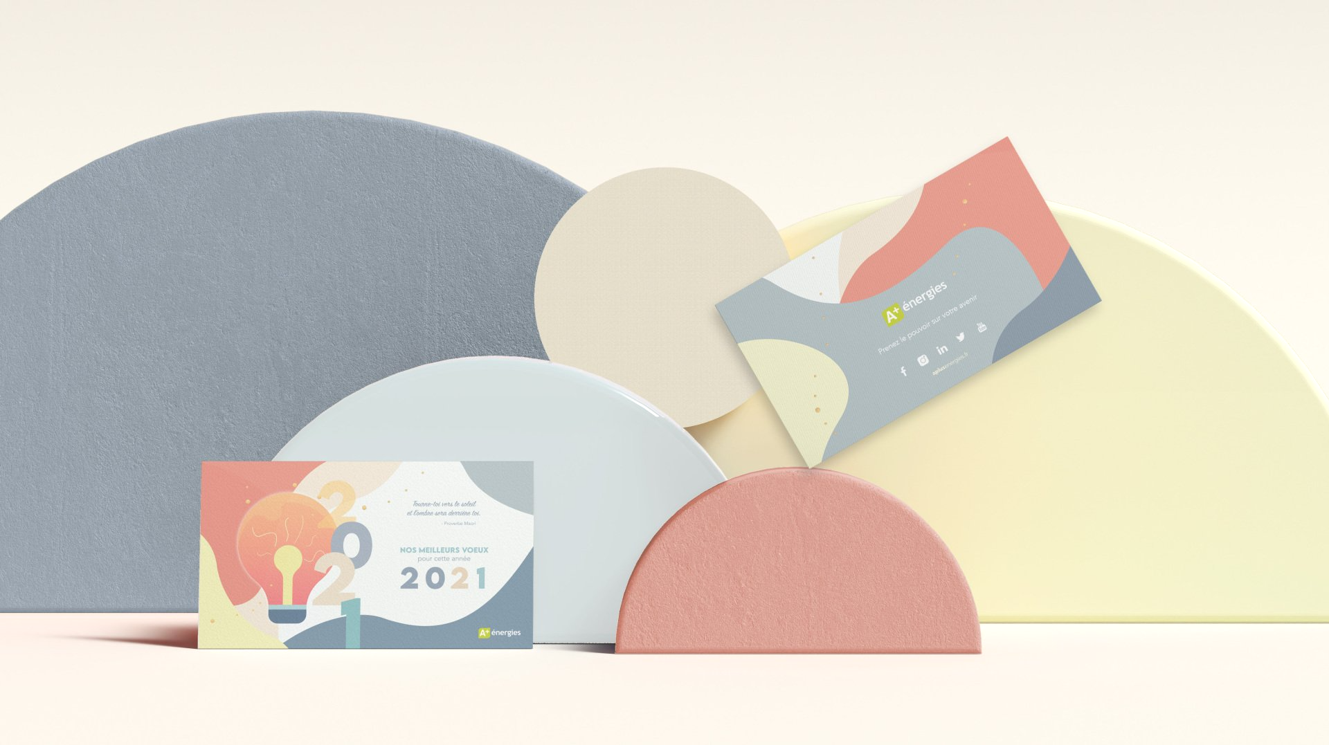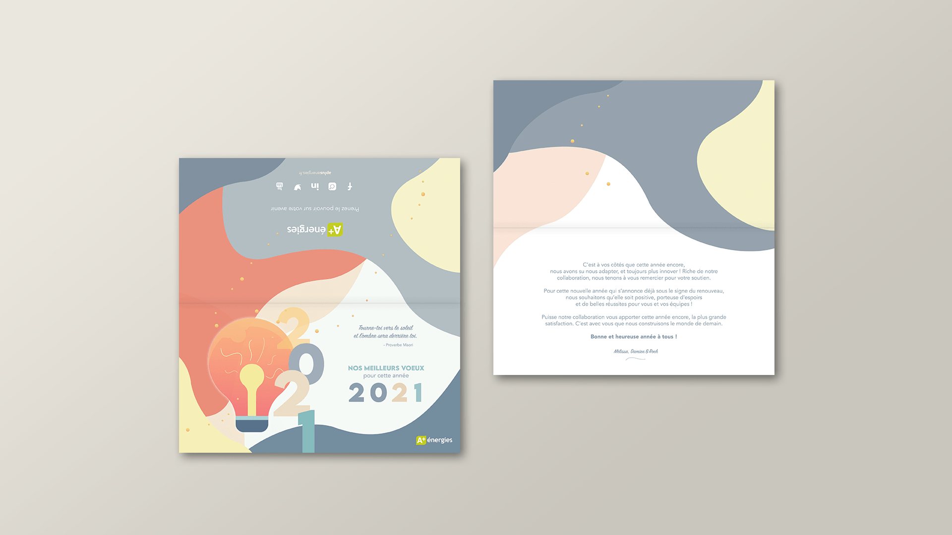 Après les débuts de la Covid-19, la carte de voeux 2021 se devait d'être apaisante, légère et pleine d'optimisme. Cette réalisation de carte de voeux destinée aux collaborateurs d'A+ énergies illustre l'envie d'un avenir plus doux et motivant. La citation positive apporte un certain réconfort aux lecteurs. Entre positivité, motivation et sérénité, la direction artistique de la carte colle parfaitement aux valeurs de l'entreprise verte. Le format est travaillé de manière à pouvoir poser la carte sur son bureau, tel un chevaler.